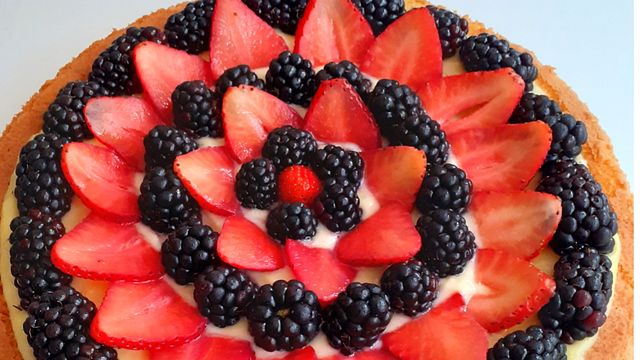 Ora potete assemblare la torta: se volete potete bagnare la base con un po’ di acqua e limoncello. Versate sopra la crema e livellate bene. Poi decorate con fragole e more come più vi piace. Mettete in frigo per una mezz’ora almeno, prima di servire.