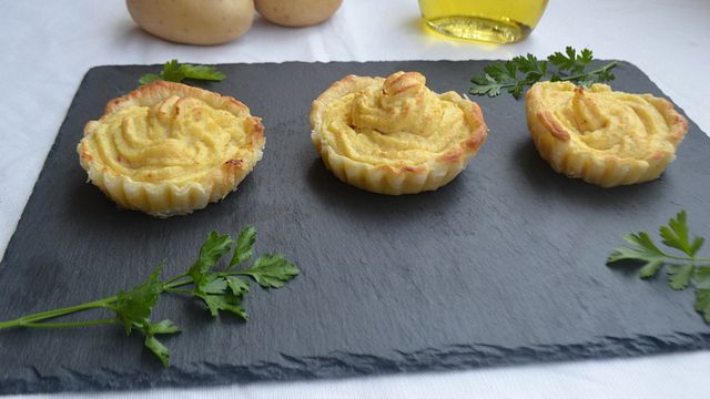 Per finire riempite la sac à poche e guarnite i vostri cestini. Dopo aver infornato per 20 minuti a 180 gradi, ecco pronti i vostri cestini di pasta sfoglia con patate.