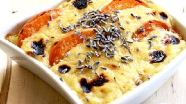 Coprire le albicocche di crema, spolverare leggermente con lo zucchero di canna e infornare per una decina di minuti scarsi sotto il grill per far colorare (due minuti prima di togliere dal forno spolverare con i fiori di lavanda secchi).
