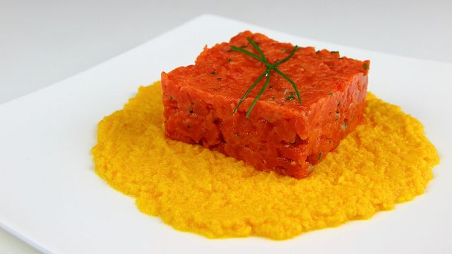 Ricetta sfiziosa, colorata e anche molto leggera e salutare la Tartare di salmone su crema di carote e mela verde. In questo periodo i nutrizionisti consigliano di privilegiare frutta, verdure e pesci ricchi di Omega 3, io ho raccolto tutti questi consigli in una ricetta davvero gustosa.