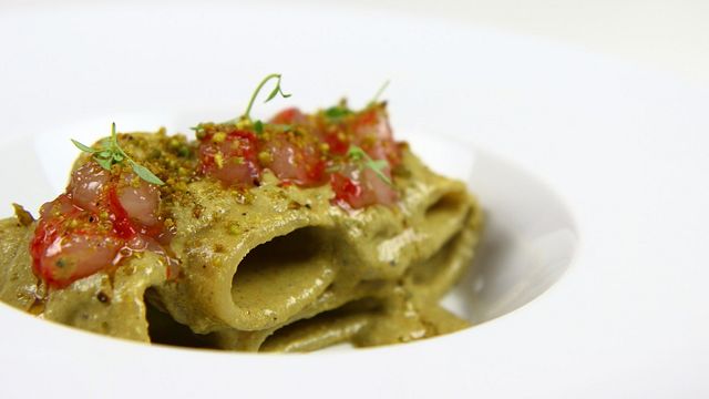 Frullate il pistacchio crudo, il basilico e l’olio con l’aglio, aggiustate di sale.