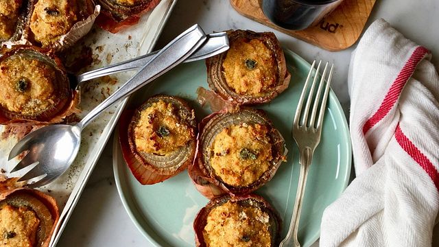 Con l’aiuto di un cucchiaio farcite le cipolle e cuocete in forno già caldo, 180 gradi funzione statica, per circa 15-20 minuti.