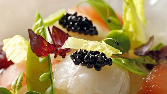 Disponete uno scampo al centro di ogni piatto, guarnite con verdure di stagione tagliate con regolarità e insaporite con l’acqua di pomodoro preparata. Ultimate con un po’ di caviale e servite.