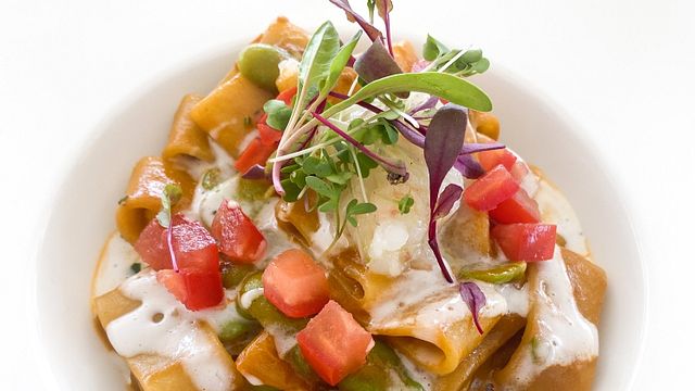 Aggiungere alla fine gli scampi puliti in precedenza, la concassè di pomodoro e le fave novelle. Aggiustare di sale e pepe.