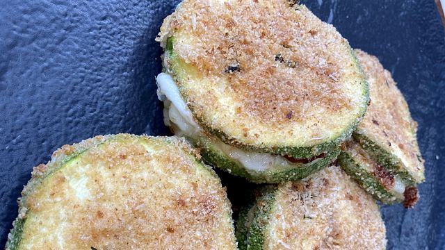 Passate le zucchine nell'uovo, farcitele con del formaggio latteria e del pomodorino tritato. Chiudete con un'altra fetta e passate nel pangrattato. Adagiate in una teglia con carta forno, un filo di olio e infornate a 180 gradi per 15 minuti. Se volete realizzare una versione più golosa, potete friggerle.