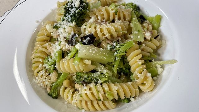 Tritate grossolanamente 2 manciate di olive nere denocciolate. Fate cuocere 180 grammi di fusilli, aggiungete ai broccoli le olive ed i pinoli insieme a due scatolette di sgombro al naturale. Saltate il tutto amalgamando.