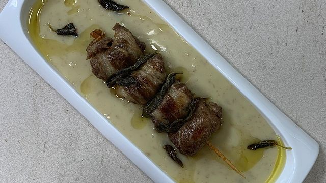 Fate tagliare dal vostro macellaio delle fette di coppa di maiale alte 1/2 centimetro. Disponetele sul tagliere, al centro di ogni fetta mettete della salvia freschissima, salate leggermente, chiudete, schiacciate e arrotolate. Infilzate i mombolini con uno stecco di legno e tra uno e l'altro mettete una foglia di salvia. In una casseruola disponete una noce di burro, 2 spicchi di aglio, 1 rametto di salvia e 1/2 bicchiere di vino bianco. Bagnate con del brodo vegetale e fate cuocere per circa due ore.