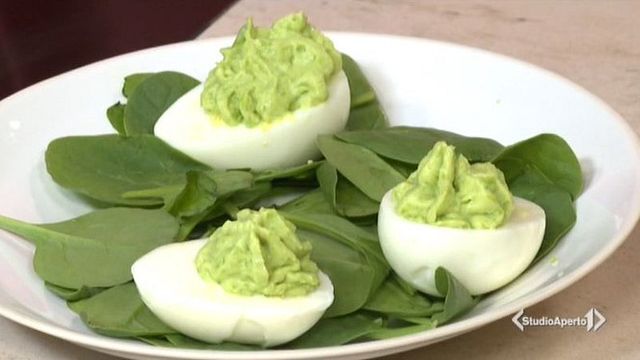Tagliate a metà le uova, togliete il rosso e frullatelo con i pisellini. Aggiungete della maionese fino ad ottenere la consistenza desiterata. Con una sac à poche farcite le uova e impiattate su un letto di morbide foglie di spinacino.