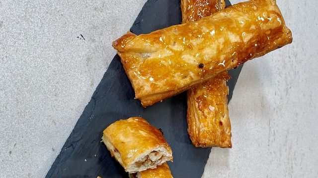 Arrotolate e sigillate bene i bordi per il senso della lunghezza. Mettete in forno statico a 200 gradi per 15 minuti. Una volta sfornate le sfogliette, spennelatele con del miele, fate raffreddare e servitele intere o a tocchetti.