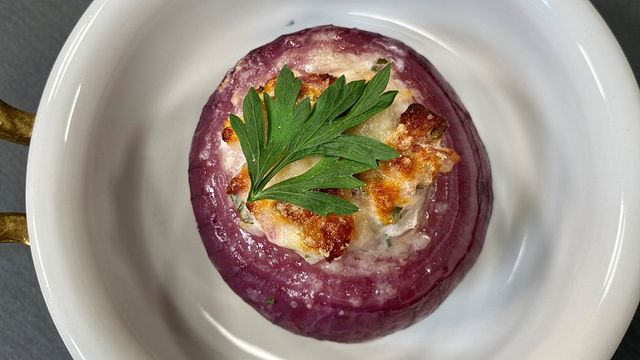 Togliete la parte esterna e tagliate la calotta di 8 cipolle rosse di Tropea, mettetele in una pentola a pressione e lessatele per 10 minuti. Con un cucchiaino togliete la parte centrale delle cipolle e tritatela finemente. Aggiungete 150 grammi di robiola di capra, 60 grammi di pancetta a cubetti, un po' di prezzemolo tritato, un giro d'olio sale e pepe.
