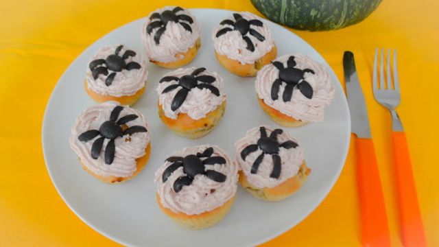 Decorate ogni muffin con la mousse, posizionatevi infine sopra un ragnetto di olive nere e i vostri muffin salati di Halloween con ragnetti sono pronti da servire!