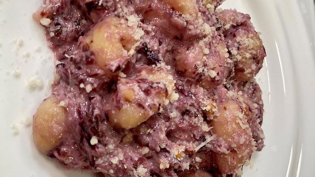 Dalla padella versate il composto in un bicchiere e con un frullatore a immersione rendete cremoso il tutto. Buttata in acqua bollente 500 grammi di gnocchi, versate la crema di radicchio in padella, aggiungete le noci sminuzzate e 150 grammi di stracchino. Scolate gli gnocchi e saltateli in padella. Serviteli spolverizzando con del formaggio grattugiato.