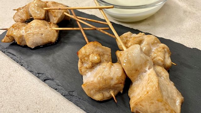 Preparate una salsina da abbinare al pollo con 125 ml di yogurt magro, 1 cucchiaio di succo di limone, olio e sale. Mettete gli spiedini di pollo su una teglia, infornate a 200 gradi per 10 minuti e ogni tanto spennellate con la salsina alla soia per mantenere morbida la carne ed insaporirla bene. Servite gli spiedini accompagnandoli con l'emulsione allo yogurt precedentemente preparata.