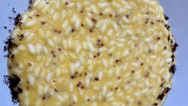 Una volta cotta frullatela con un mixer oppure passate a setaccio con maglia fine. In un pentolino con bordo alto, iniziate a tostare il riso a secco con solo una presa di sale e senza grassi. Una volta che il cereale sarà caldo bagnate con l’acqua, fate evaporare e procedete alla cottura per circa 13 minuti alternando crema di zucca e acqua, di tanto in tanto assaggiate il riso e regolate di sale. Una volta cotto togliete dal fuoco e aggiungete il burro e la senape. Mescolate e aggiungete il parmigiano reggiano e la scorza di limone. Finite con del succo di limone. Mettete nel piatto e aggiungete la polvere di caffè.