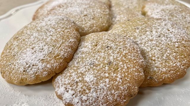 In una ciotola mettete un uovo, del burro ammorbidito e aggiungete 50 grammi di farina di pistacchi. Amalgamate bene con una forchetta, aggiungete 80 grammi di zucchero a velo e la scorza grattugiata di mezzo limone. Unite 1/2 cucchiaino di lievito e gradualmente 200 grammi di farina. Impastate con le mani fino ad ottenere un composto liscio e compatto.