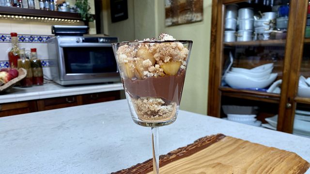 In un'altra casseruola andate a sciogliere 80 grammi di zucchero, 50 grammi di amido di mais e un pizzico di cannella. Versateci sopra il latte precedentemente scaldato. Fuori fuoco aggiungete 150 grammi di cioccolato fondente tritato a coltello e una noce di burro. Fate sciogliere bene il tutto. Servite in un bicchiere e mettete un primo strato di base croccante, uno strato di crema al cioccolato e le pere caramellate. Potete aggiungere un ultimo strato croccante di crumble o scegliere diversamente a seconda del vostro gusto o di quello dei vostri commensali.