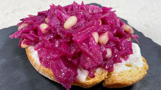 Affettate sottilmente, con una mandolina, 200 grammi di cavolo cappuccio rosso e mettetelo in pentola con l'aggiunta di olio Evo. Salate per facilitare la fuoriuscita naturale dell'acqua della verdura, coprite e lasciate stufare e appassire a fuoco medio basso. Al bisogno allungate con acqua. Nel frattempo preparate dei crostini di pane, oliatelo e mettetelo in forno per renderlo croccante.