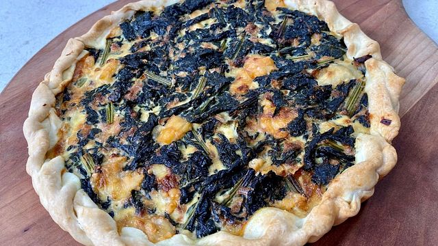 Aggiungete 200 grammi di formaggio tagliato a tocchetti, un po' di timo, 80 grammi di formaggio grattugiato, 3 uova, sale e pepe. Mettete una pasta brisè rotonda con carta forno in una teglia, disponete il composto, chiudete bene i bordi e infornate a 180 gradi, in forno statico per 30 minuti.