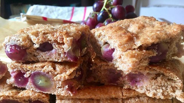 Aggiungete l?uva, cospargete con zucchero di canna, stendete il secondo panetto di impasto della stessa grandezza del precedente, coprite l?uva, sigillate i bordi della focaccia bucherellando la superficie con uno stecchino.
