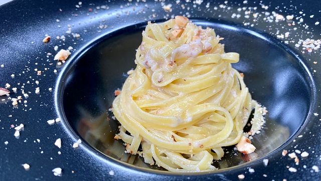 Scolate la pasta al dente poichè deve essere ripassata. Mantecate con acqua, 20 grammi di formaggio grattugiato e ultimate con la granella rimasta.