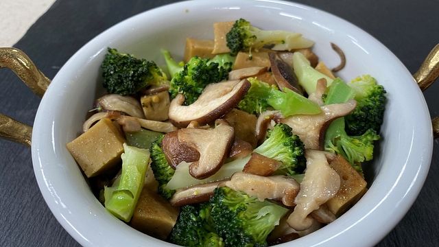 In una delle due, la più piccola, saltate i funghi e salate solo alla fine. Nell'altra aggiungete del peperoncino, il seitan, il broccolo e completate la cottura lasciando la verdura croccante. Al bisogno aggiungete dell'acqua. Impiattate unendo le due preparazioni.