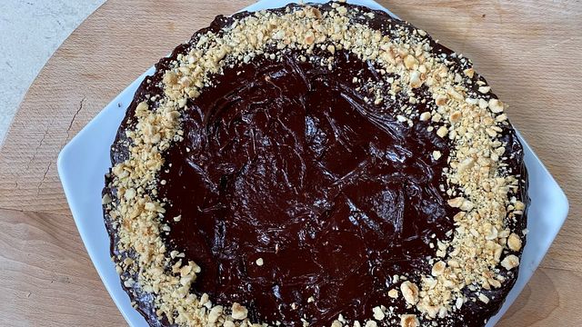 Amalgamate bene, mettete in uno stampo da forno da 24 cm di diametro, infornate a 180 gradi per 25/30 minuti. Scaldate 200 grammi di panna, sciogliete 200 grammi di cioccolato fondente tritato e una noce di burro. Versate nel centro della torta e spatolate su tutta la superficie. Completate con la granella di nocciole.