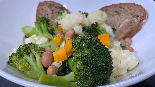 Fate appassire bene in olio Evo 90 grammi di cipolla a fettine, aggiungete 80 grammi di carote e 1 gambo di sedano tagliati a dadini. Allungate con brodo vegetale e, dopo aver lasciato cuocere qualche minuto, aggiungete le coste, i cavolfiori e i broccoli.