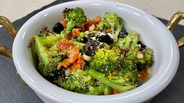 Mettete da parte i broccoli e su una teglia componete un letto di batate. Ai broccoli aggiungete i pomodorini sott’olio precedentemente tagliati, olive, 20 g di pinoli, olio e sale. Adagiate il tutto al letto di batate e aggiungete pangrattato e peperoncino. Infornate a 180 gradi per 15/20 minuti.