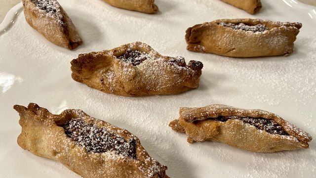 Per il composto, lavorate 120 g di zucchero con un uovo e un tuorlo. Aggiungete 60 g di olio di mais e, gradualmente, 300 g di farina 00 e un cucchiaio abbondante di lievito per dolci. Impastate fino ad ottenere un panetto omogeneo. Fate riposare il panetto in frigorifero per 20 minuti. Adagiate un po’ di farina sul piano e con un mattarello stendete la frolla. Ritagliate rettangoli di circa 6 cm. Al centro dei rettangoli adagiate la farcia. Chiudete i rettangoli. Infornate a 180 gradi per 20 minuti. Spolverate con zucchero a velo.