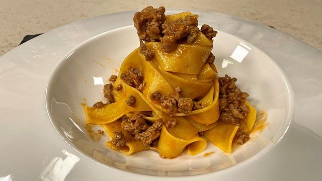 Allungate con 450 ml di brodo vegetale e regolate di sale e pepe. Coprite con il coperchio e fate cuocere a fuoco lento per circa 60 minuti. Portate a ebollizione abbondante acqua salata e cuocete 280 g di pappardelle. Scolate le pappardelle e conditele con il ragù d’anatra.