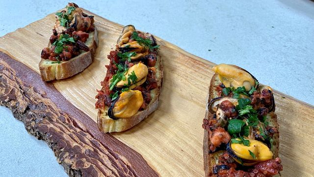 Tritate le olive nere denocciolate. Aggiungete 200 g di polpa di pomodoro ai moscardini, poi regolate di sale e cuocete fino al punto in cui la polpa si sarà ritirata. Filtrate il sughetto di cottura delle cozze e aggiungetelo ai moscardini per completare la cottura. In una ciotola aggiungete i moscardini e le cozze. Completate aggiungendo il tutto alle fette tostate di pane toscano.