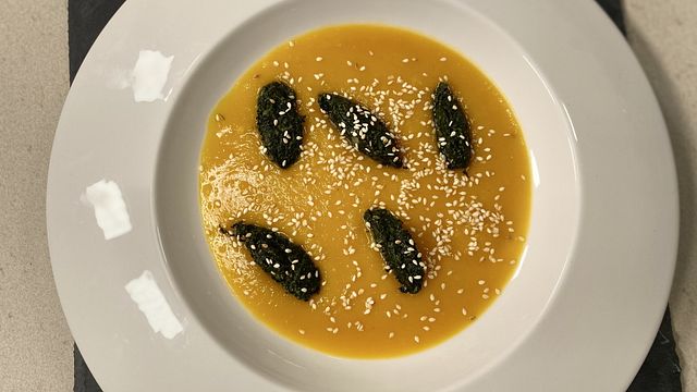 Nel frattempo frullate il cavolo nero con un mixer a immersione fino a ottenere una crema densa. Se la crema fosse eccessivamente liquida, potete utilizzare 5 g di amido di mais. Frullate anche la zucca, sempre con un mixer a immersione. Adagiate la crema di zucca in una fondina, aggiungete le quenelle di cavolo nero e completate con 10 g di semi di sesamo tostati.
