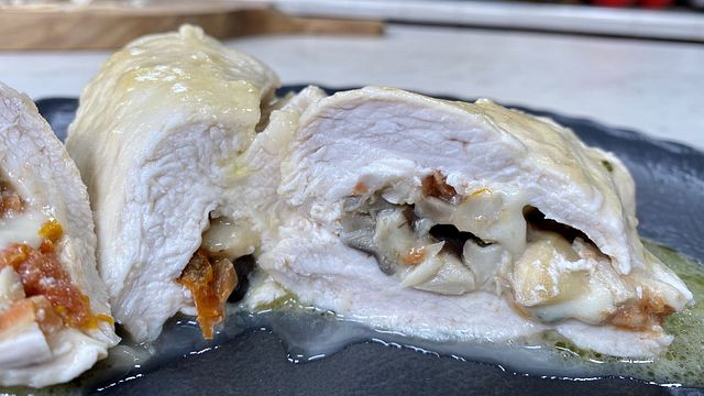 Incidete le tasche in 4 petti di pollo con un coltello dalla lama sottile. In una pentola aggiungete dell’olio e 1 spicchio d’aglio, poi fate saltare 200 g di funghi a fettine. Nel frattempo tritate 2 pomodori secchi precedentemente rinvigoriti in acqua tiepida. Tagliate a pezzettini 150 g di scamorza. Versate in una ciotola i pomodori secchi e la scamorza. Al termine della cottura insaporite i funghi con del sale. Tagliuzzate i funghi fino a ottenere piccoli pezzi, poi aggiungeteli ai pomodori secchi e alla scamorza. Amalgamate il tutto e aggiungete del timo.