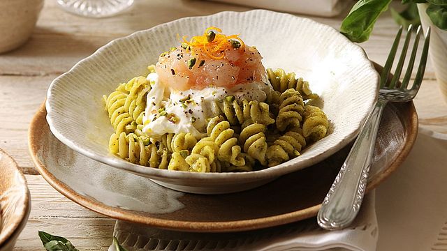 Distribuite nel piatto prima i fusilli, poi la stracciatella, la tartare di gamberi e infine le scorzette di arancia e un po’ di granella di pistacchi.