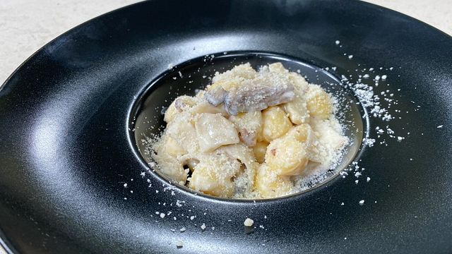 Mettete 80 grammi di panna nella stessa padella dove avete cotto i funghi e le castagne (messe da parte) buttate 250 grammi di gnocchetti in acqua bollente salata, a fine cottura passateli nella pentola con la panna e in ultimo aggiungete i funghi e le castagne. Impiattate con un po' di pecorino a piacere.