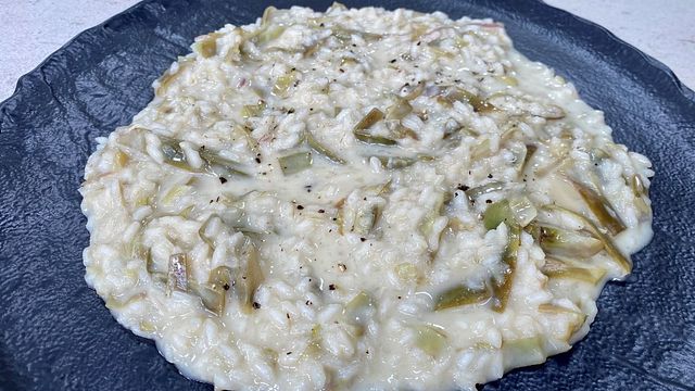 Sfumate a fuoco alto poi abbassate la fiamma e iniziate ad allungare con il brodo vegetale. Ricordate che il risotto deve sobbollire. Salate. Fuori fuoco, mantecate con 100 grammi di taleggio e fate sciogliere aiutandovi con del brodo. In ultimo aggiungete del formaggio grattugiato. Unite del pepe a piacere.