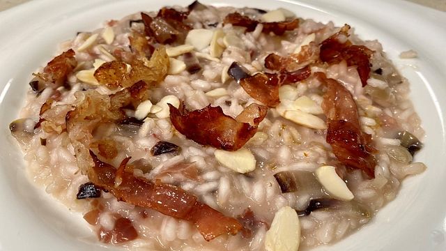 Aggiungete al riso il radicchio con lo speck e completate la cottura. In una padella mettete lo speck rimasto con un poco d'olio e rendetelo croccante. Mantecate il riso fuori fuoco con una noce di burro e un po' di formaggio grattugiato.