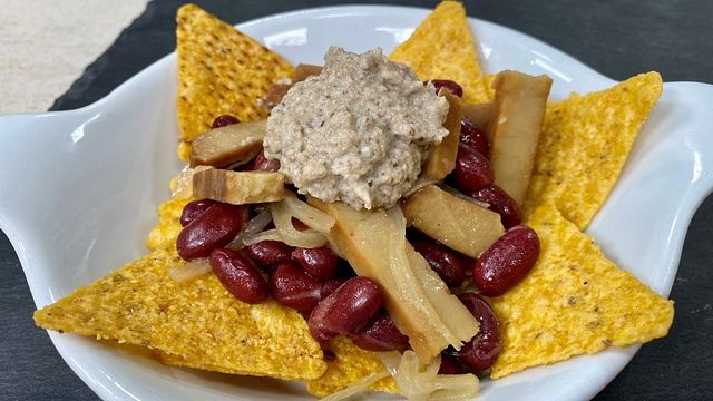 Rosolate in olio Evo 1 spicchio di aglio, aggiungete 200 grammi di funghi, 50 grammi di panna vegetale, fate cuocere per qualche minuto e frullate. Quando il seitan si è ammorbidito aggiungete 250 grammi di fagioli neri. Preparate i piatti da portata mettendo prima i nachos, poi il seitan concludendo con la cremina ai funghi.