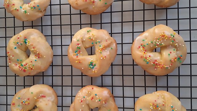 Se volete potete decorare le ciambelline, una volta fredde, con una glassa fatta con zucchero a velo, qualche goccia di limone e acqua. Guarnite con confettini colorati.