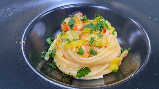 Tagliate un porro a rondelle e mettetelo a dorare in padella con olio Evo. Nel frattempo preparate una dozzina di gamberi, alcuni lasciateli interi altri tagliateli a pezzettini. Buttate in acqua 320 grammi di linguine. Spremete il succo di 1 arancia.
