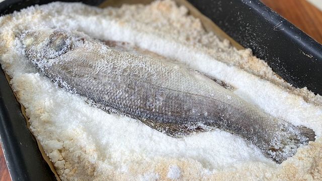 Mescolate 1,5 kg di sale grosso e 1,5 di sale fino, sbattete 3 albumi e aggiungeteli al sale insieme a 125 ml di acqua. Prendete una teglia, mettete un foglio di carta forno e un primo strato di sale. Appoggiate poi il pesce bianco eviscerato e completate la copertura con il sale rimasto.