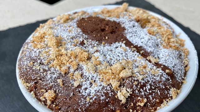 Sbucciate e tagliate a dadini 1/2 pera, aggiungete 1/2 cucchiaino di zucchero di canna e fate cuocere nel microonde per 60 - 90 secondi. Aggiungete 10 amaretti sbriciolati. In un'altra ciotola amalgamate 1 uovo con 1 cucchiaio di olio di semi, 3 cucchiai di latte, 2 cucchiai di zucchero di canna, 3 cucchiai di farina,1 cucchiaio di cacao amaro in polvere e 1 cucchiaino di lievito.