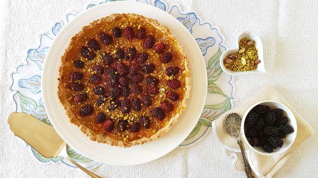 Premete bene l’impasto contro i bordi e riempite la base con la confettura. Decorate con le more creando alcuni di cerchi.