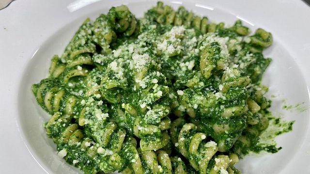 Cuocete i fusilli, integrali se preferite. Una volta scolata, aggiungete la pasta al pesto e saltatela con poca acqua di cottura. Servite con formaggio grattugiato a piacere.