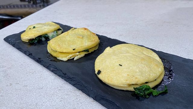 Tritate gli spinaci con una mezzaluna ricordandovi di eliminare l'aglio e aggiungete 100 grammi di provola tagliata a cubetti. Coppate la sfoglia di ceci per creare delle focaccine. Scaldate dell'olio Evo in padella, fate cuocere le focaccine qualche minuto per lato. Salate, farcitene la metà con gli spinaci e provola e coprite con l'altra focaccina.