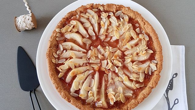 Una torta realizzata con un fragrante guscio di pasta frolla alla vaniglia e uno squisito ripieno di confettura, deliziose pere di stagione e mandorle croccanti.
