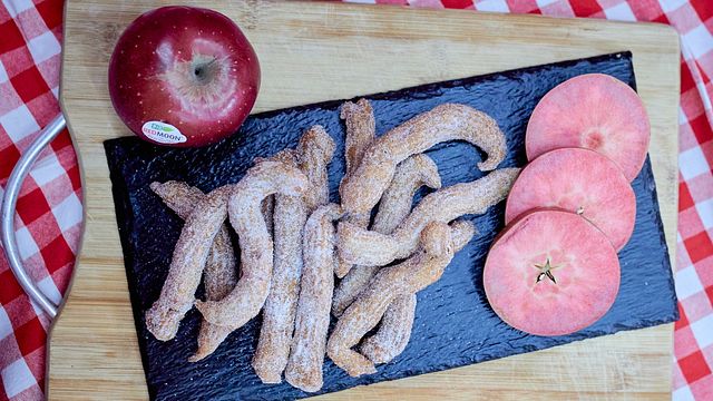 Per il blog "La gaia cucina di Patty" vi propongo la mia versione dei churros alle mele. Un dolcetto gustoso per la preparazione del quale ho usato la farina di farro, salutare e saporita, e delle belle mele rosse, dentro e fuori. Questa qualità si chiama Red Moon e ha la caratteristica di avere anche la polpa rossa.