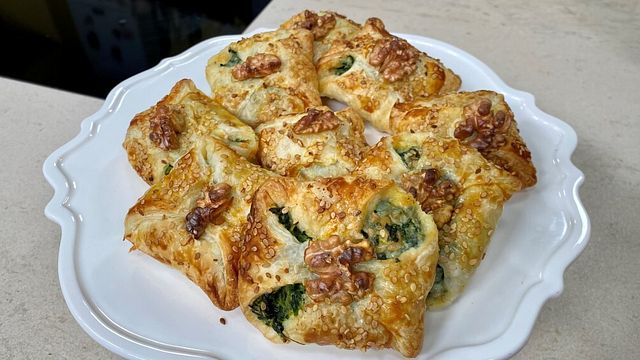Farcite ogni quadrato con il ripieno di spinaci e gorgonzola e richiudeteli con i quattro angoli al centro. Spennellate la superficie con l’uovo sbattuto, decorate con un gheriglio di noce disposto al centro e cospargete con i semi di sesamo. Infornate a 200°C e cuocete per 25 minuti o fino a quando i fagottini saranno dorati. Sfornateli, lasciateli intiepidire e serviteli.