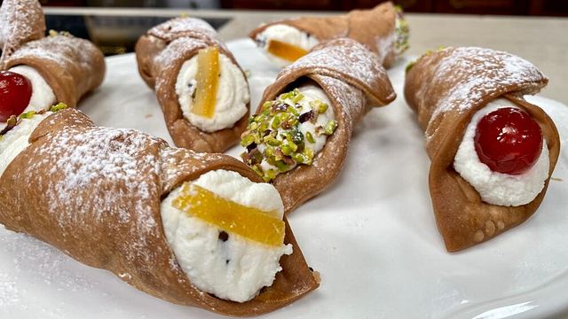 Stendete l’impasto, ripiegatelo su se stesso e passatelo per 2-3 volte in una macchina tirapasta, in modo tale da ottenere una sfoglia liscia di circa 2 millimetri. Appoggiate la sfoglia sul piano infarinato e, con una rotella, tagliate dei quadrati di circa 10 centimetri per lato. Prendete il primo quadrato, adagiate sopra un bastoncino per cannolo e, dopo aver spennellato la sfoglia con 1 tuorlo sbattuto, andate a chiudere il cannolo. Portate 1 litro di olio di semi a 175 gradi. Friggete i cannoli nell’olio bollente per 1 minuto. Farcite i cannoli con la ricotta, infine decorateli con arance e ciliegie candite, granella di pistacchi e zucchero a velo.