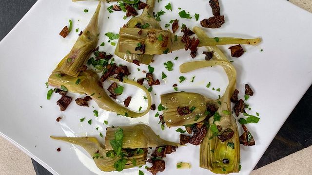 Aggiungete un mestolo di acqua e limone usato per tenere a bagno i carciofi e coprite nuovamente. Fate cuocere per 3/4 minuti e salate. Saltate i funghi in padella con olio Evo e 1 spicchio di aglio. Al momento di andare in tavola, unite i funghi e i carciofi, salate e fate scaldare a fuoco alto.